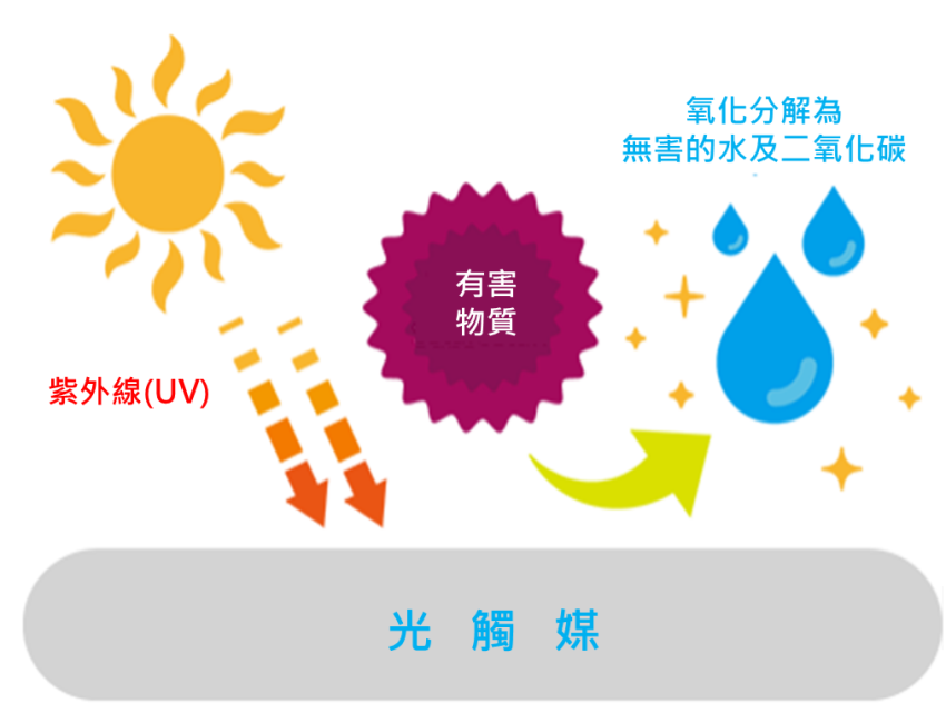 光觸媒可以有效地降解多樣污染物質,如:甲醛、苯、甲苯、二甲苯、氨、VOCs等,並具有高效的消毒性能,能將細菌或真菌釋放出的毒素分解及無害化處理。