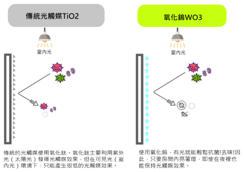 一般消毒藥劑可將微生物殺死,卻不能將其屍體分解。以70%的酒精來說,它無法殺死腸病毒,但光觸媒在適當的設計下,可以將病毒細菌不只是殺死,而是將病毒細菌(有機物質構造)分解成為無害的水或及二氧化碳。簡單的說它是利用其氫氧根及氧將其分解,它的氧化能量比臭氧還高,一般之抗病毒劑是無此功能,因此它可作為對大腸桿菌、黃色葡萄球菌等優良的預防性抗病毒材料。