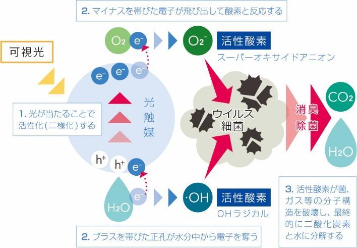 當可見光照射到Medical Nanocoat的氧化鎢(可見光即可感應催化)上時,就會產生活性氧。 活性氧具有氧化分解有機物的特性,破壞病毒外部結構的蛋白質(有機物)並使其失去活性*。 光觸媒在暴露於光的情況下可重複相同的化學反應數次,因此只要表面不被刮擦或剝落,效果就會持續。